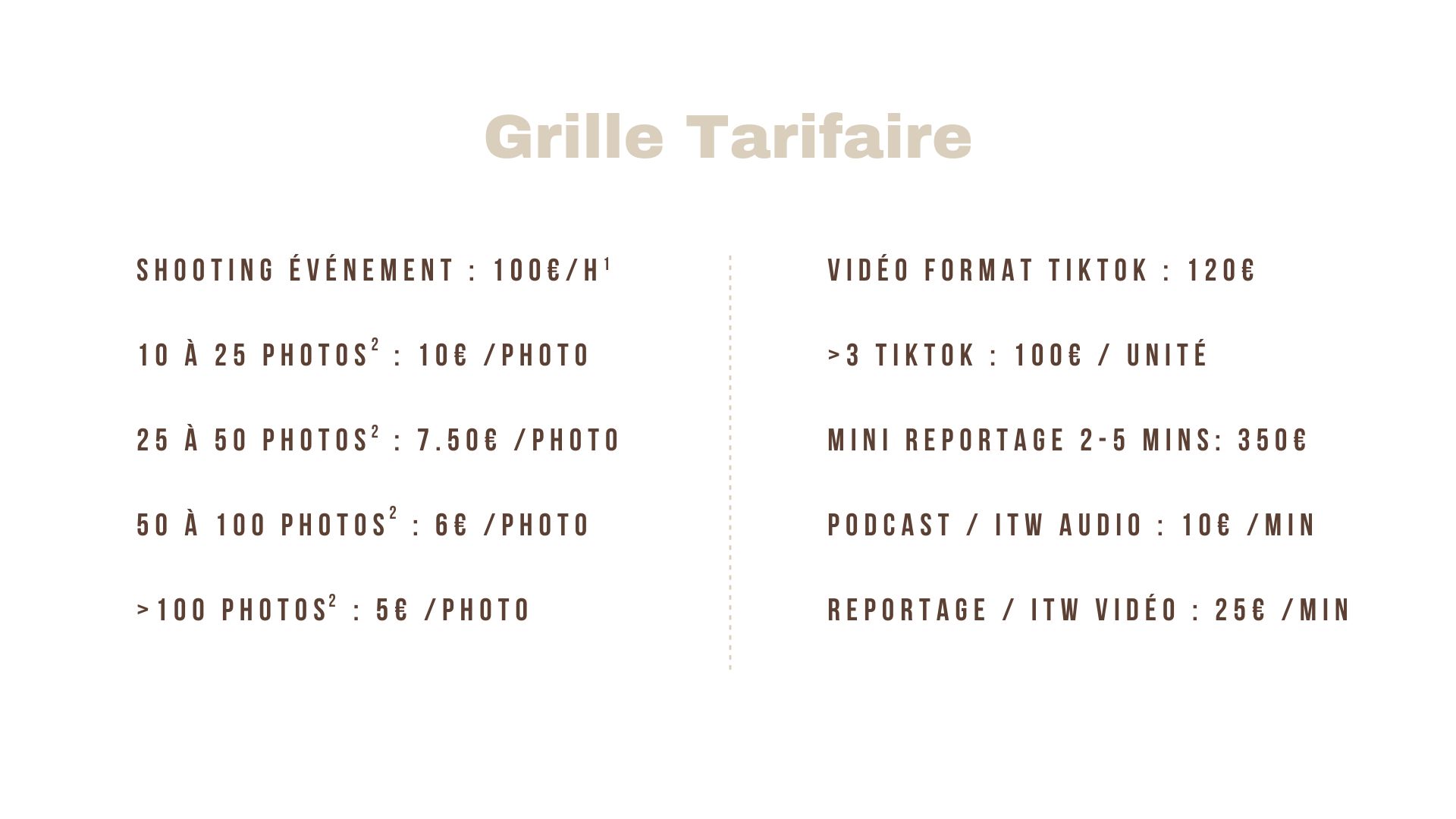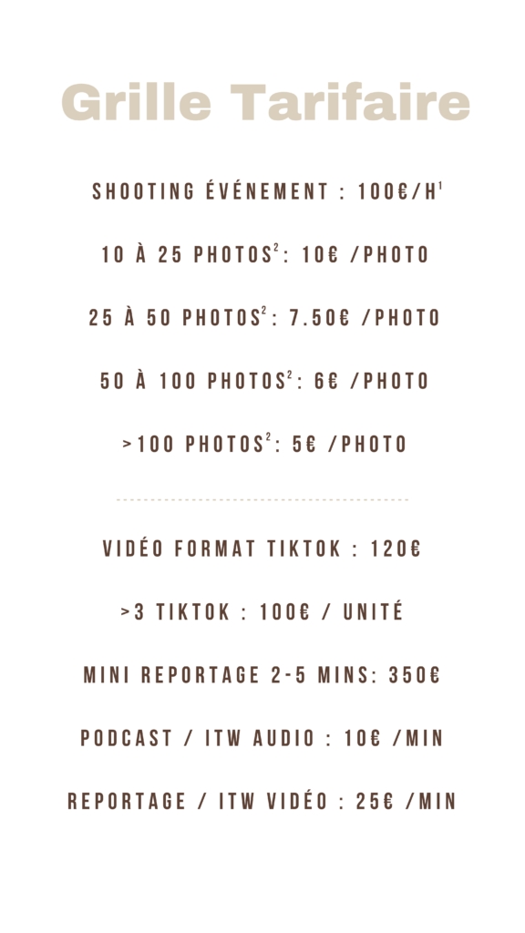 1. Comprenant uniquement le temps en shooting et non le temps de tri et de retouches des images, tarification valable uniquement pour la photo d’événement.